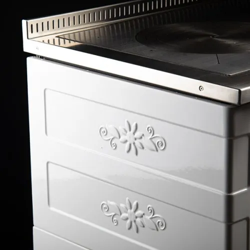Der Kaminofen kann auf Wunsch mit einer Herdstange, einem Mehrfachanschluss sowie einem schwarzen Sockel ausgestattet werden. Zusätzlich besteht die Möglichkeit, zwischen zwei Stahl-Herdplatten sowie einer Glaskeramik-Herdplatte zu wählen.